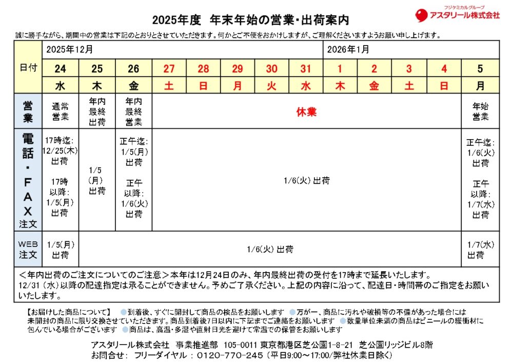 誠に勝手ながら、期間中の出荷・営業は下記のとおりとさせていただきます。